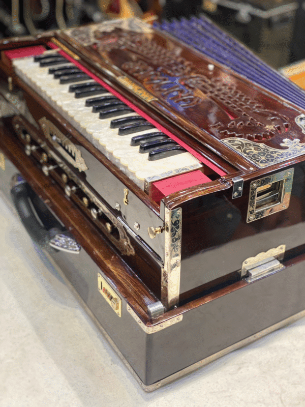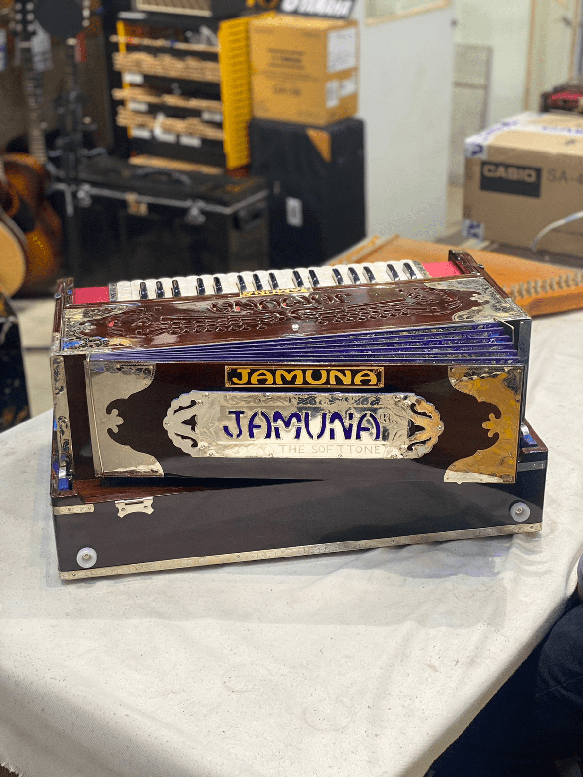Introducing the Jamuna Signature Scale-Changer Harmonium, a top-tier instrument meticulously crafted by JAMUNA MUSICALS (Est. 1936) for professional vocalists, advanced harmonium players, and premium clients who demand nothing but the best. This harmonium features Original 1st Quality Palitana Star Premium Reeds in a 3-line Khardi Kangi reed board with a Male, Male & Female (Madin) setup—delivering a sharp, bright, and concert-quality tone suitable for all forms of music. Built from full Burma teak wood and adorned with hand-engraved brass fittings, the harmonium exudes both elegance and durability. Its scale changer mechanism offers 9 smooth-changing modes, paired with 3 octaves (saptak), English-style high-quality keys with a protective key guard, and a 7-fold bellow system (pakha) for powerful, responsive airflow. Additional features include left-side coupler keys, functional stoppers and drones (laatu), and a folding design for portability. With its full lacquer polish, best seasoned wood, and unmatched craftsmanship, this harmonium truly stands as a symbol of excellence from the trusted brand JAMUNA®.