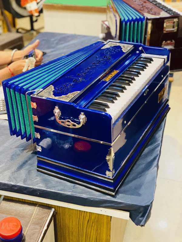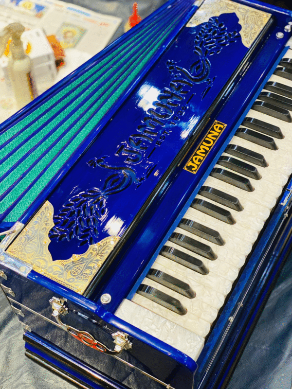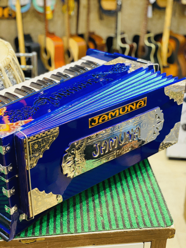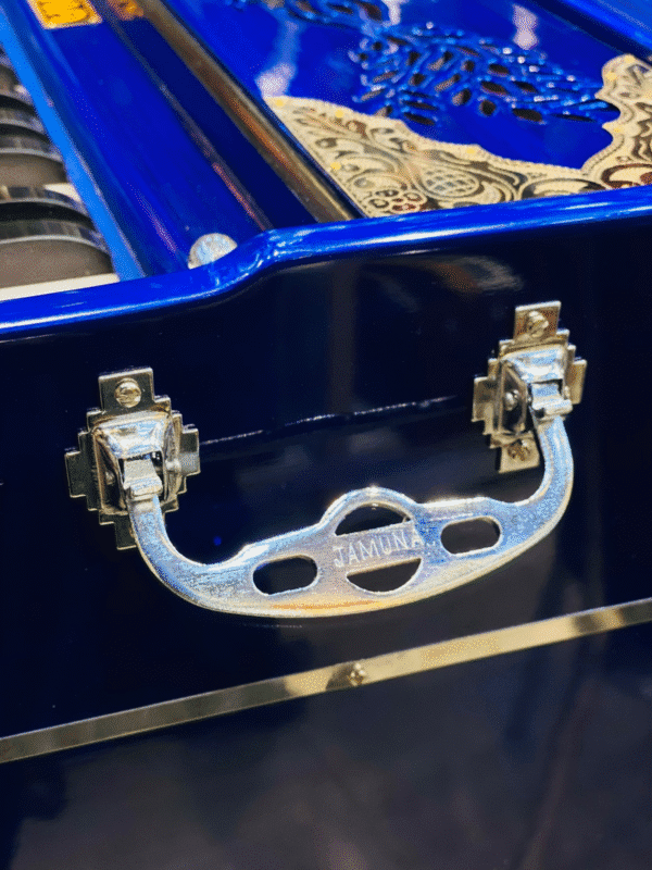 Discover timeless craftsmanship with the JAMUNA® Standing Harmonium, a professional-grade instrument from Jamuna Musicals (Est. 1936)—a brand trusted for generations. This premium harmonium features 3-line Khadi Kangi Bass Male Madin reeds with vertical-line (Khardi Kangi) construction, delivering a super bright tonal quality ideal for stage, studio, or devotional music. The harmonium’s elegance is enhanced by a signature Jamuna-designed top panel with brass plates and a striking royal blue finish that sets it apart. Handcrafted from seasoned imported wood, it includes custom-tuned reeds, 3.5-octave range, and left-side coupler keys for dynamic performance control. The 7-fold bellows (pakha) ensure smooth, sustained airflow, while the stopper-free (laatu/drones) design allows for a clean and uninterrupted sound. Finished with excellent polish and built using the best quality wood, this harmonium blends tradition, innovation, and style—only from JAMUNA®.