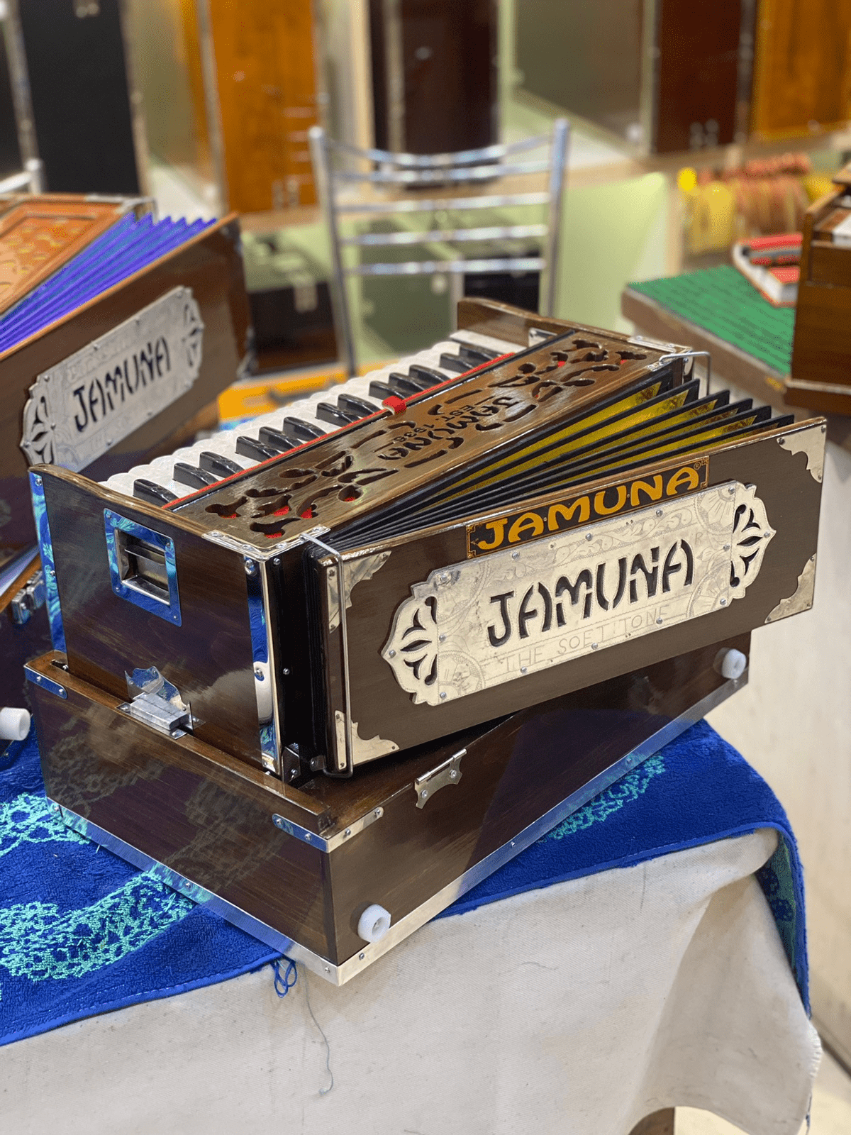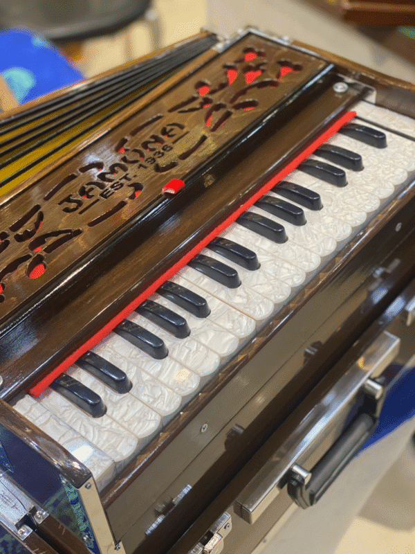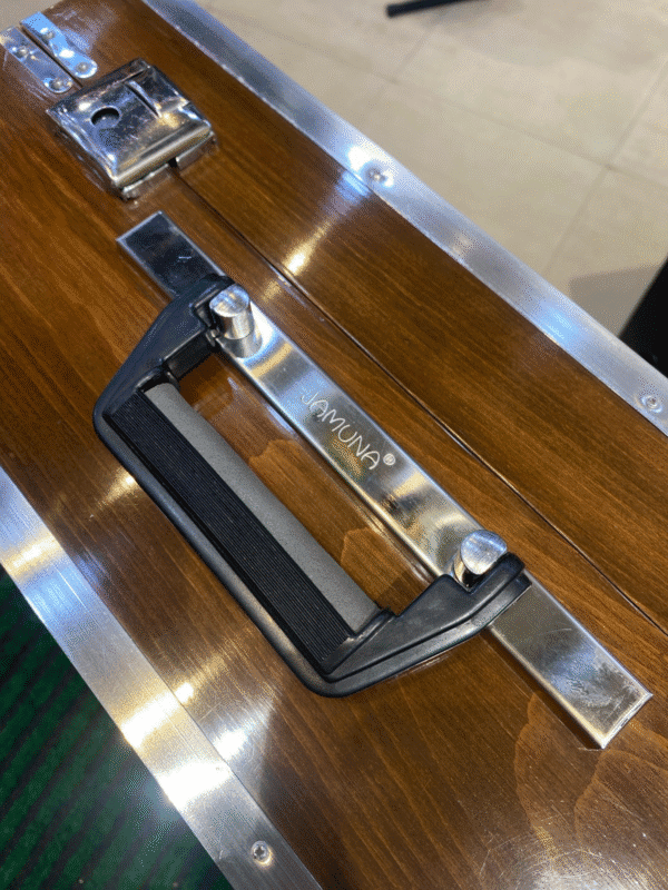 The Jamuna Folding Harmonium from JAMUNA MUSICALS (Est. 1936) offers a perfect balance of portability, tone, and craftsmanship—ideal for students, travelers, and light-stage performers. This model features 2-line Bass Male reeds with a flat Baithi Kangi (horizontal reed board) for a smooth and balanced sound. It includes customized reeds and the signature Jamuna design top panel, enhancing both aesthetics and resonance.