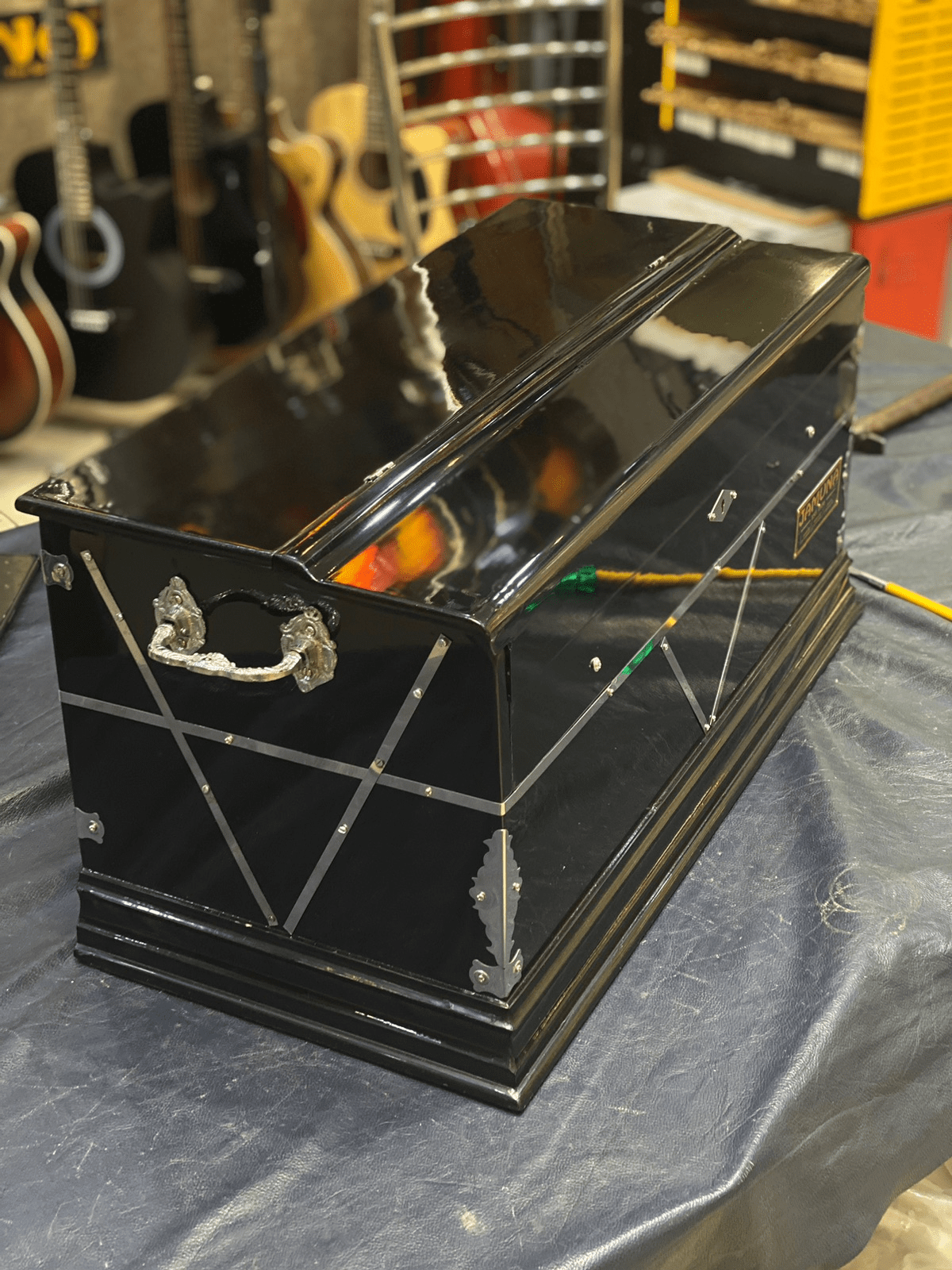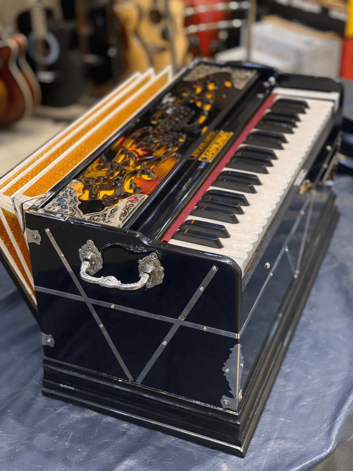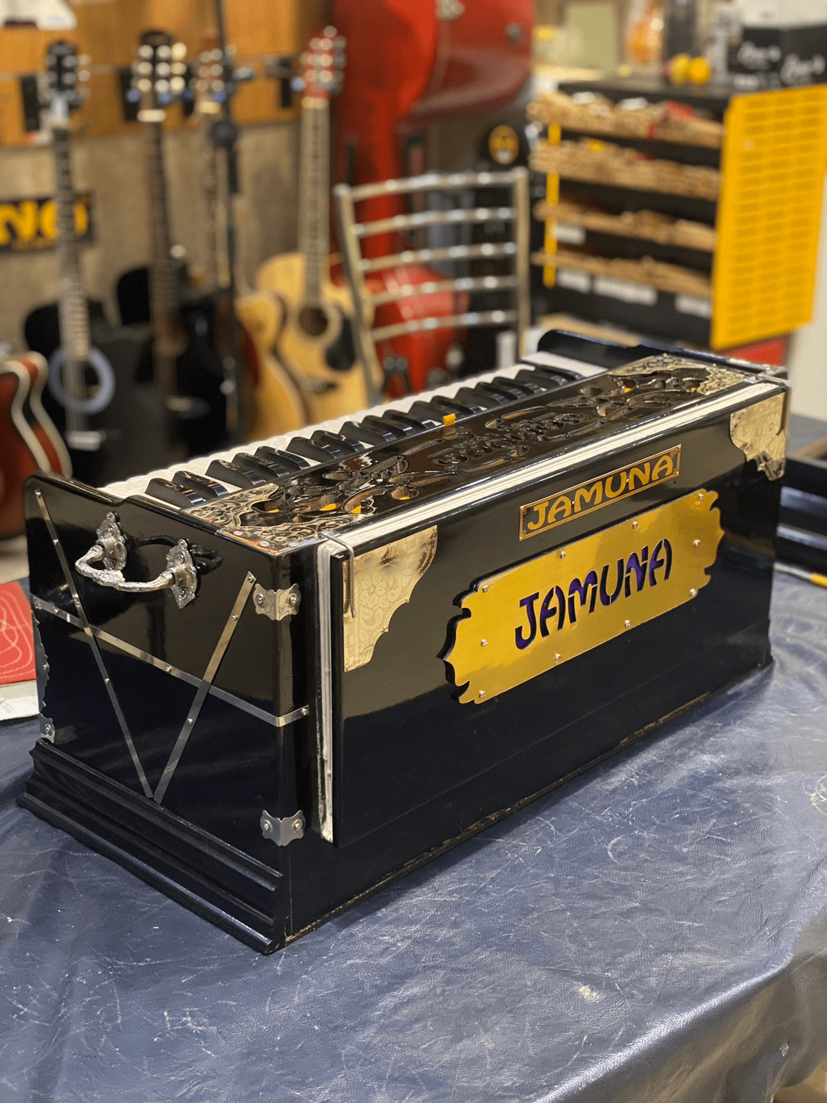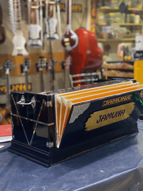 Introducing the Jamuna Concert-Grade Standing Harmonium, expertly crafted by JAMUNA MUSICALS (Est. 1936)—a brand celebrated for its excellence in Indian classical instruments. Designed for professional and concert use, this harmonium features 3-line Bass Male-Female JAMUNA Premium Reeds on a Khardi Kangi (vertical line) reed-board, producing a powerful, bright, and resonant tonal output ideal for live performances. Its standing build ensures solid projection and stage presence, while the triple-fold bellows (pakha) provide smooth, responsive airflow. With a 3.5-octave (saptak) range and left-side coupler keys, this instrument offers great expressive depth and dynamic control. Crafted from best quality wood and finished with an excellent polish, it balances durability with refined aesthetics. Built without stoppers (laatu or drones) for clean tonal flow, this harmonium is a top-tier choice for artists who demand reliability and brilliance. Choose the legacy and performance of JAMUNA®—trusted by musicians since 1936.